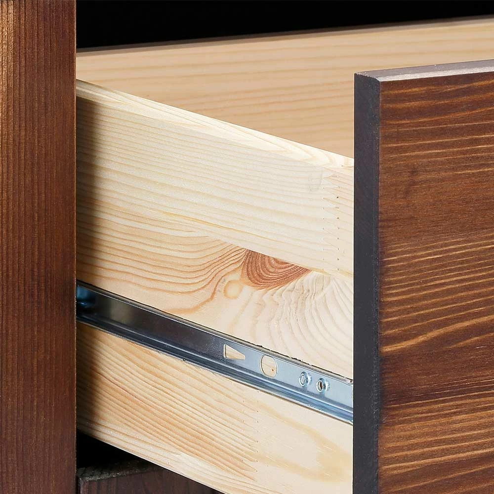 - Durch die unterschiedlich verlaufenden Holzfasern (horizontal und vertikal verarbeitet), unterscheiden sich die Farbnuancen von Korpus und Schubladen