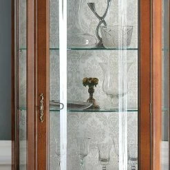 - Eine Glastür, hinter der sich drei Einlegeböden aus Glas und einer aus Holz verbergen, der Türrahmen ist aus Tulpenbaum Massivholz, die Füllung der Tür aus Pappelholz gefertigt, mit handgearbeiteten Intarsien geschmückt