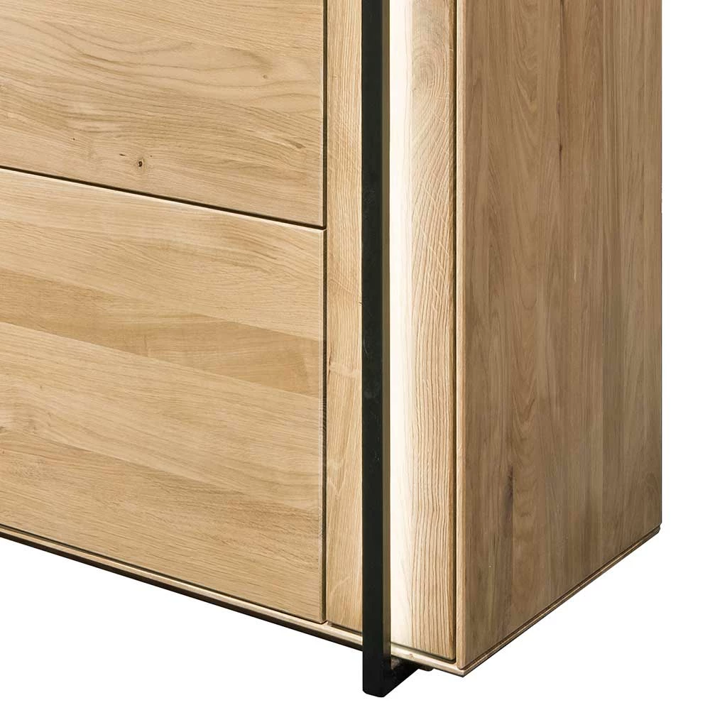 - Pflegeleicht geölte Oberfläche, durchgehende Lamellen, Türen innen keilgezinkt, Metall schwarz pulverbeschichtet