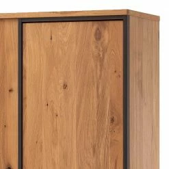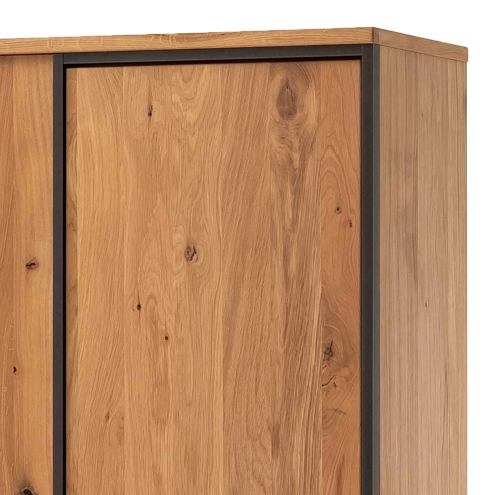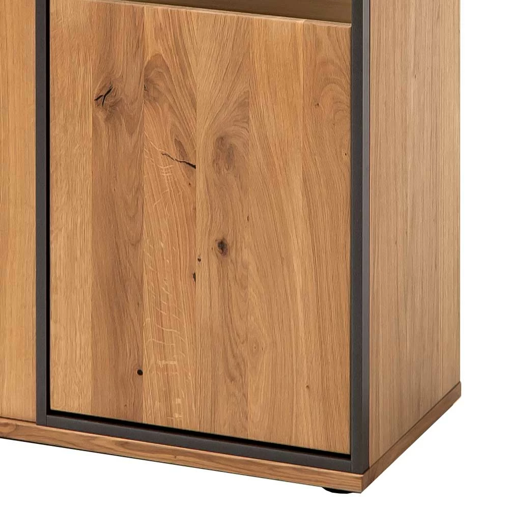 - Front Asteiche hell geölt, durchgehende Lamelle, Korpus außen mit Eiche Echtholz furniert und hell geölt, innen foliert in Holzoptik Eiche Bianco, Metall anthrazit pulverbeschichtet